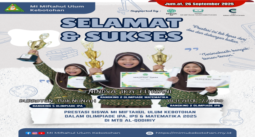 Kami, keluarga besar MI Miftahul Ulum Kebotohan, merasa sangat bangga dengan perjuangan ketiga siswa ini. Semoga prestasi mereka menjadi inspirasi bagi teman-teman yang lain untuk terus bersemangat dalam belajar, berkompetisi secara sehat, dan berani mengukir prestasi.